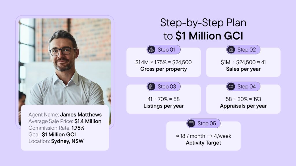 Meet James Matthews, a sales agent targeting $1 million in GCI for the first time. It’s a goal many agents share. Whether you’re aiming for $200K as a new starter, $1M as an experienced agent, or $5M as an office, the principle remains the same. Only the underlying metrics shift.